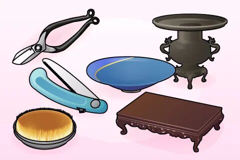 插花时使用的花瓶和花剪等工具。根据插花的大小选择合适的工具。工具主要分为插花前使用的工具和插花时使用的工具。