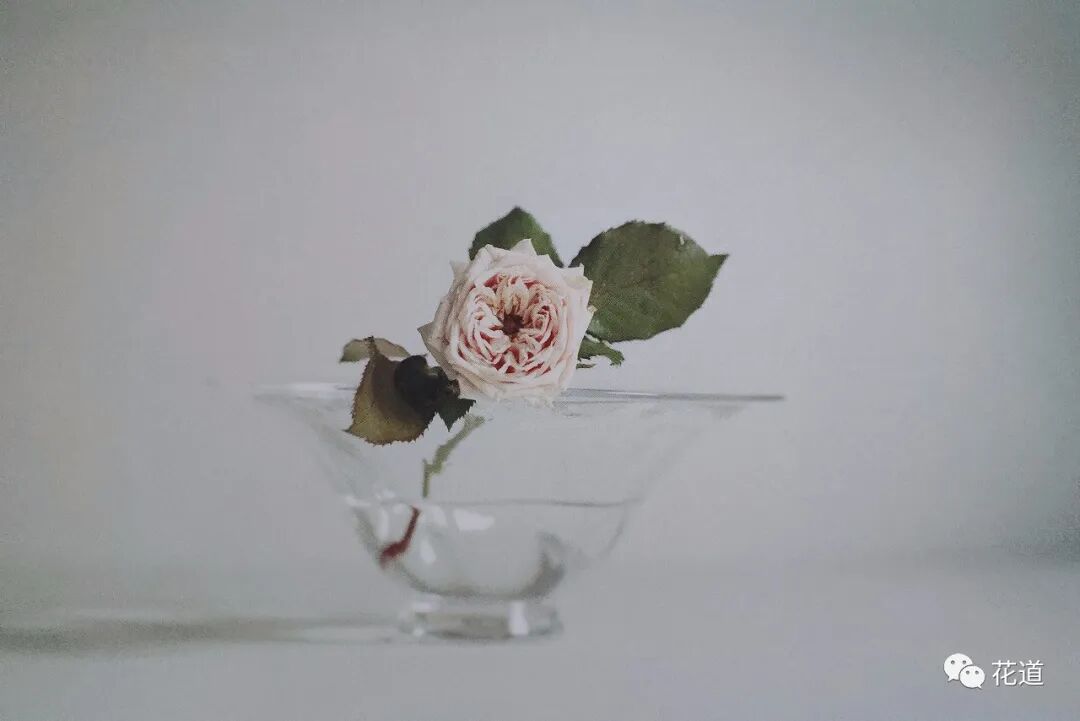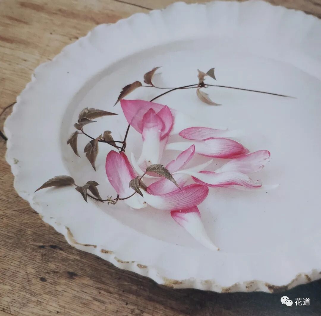 凋零的花瓣,如芍药、牡丹、玫瑰、大丽花、绣球、郁金香、菊等花材,如果花瓣凋零或者花茎折断,可选择漂浮的插法,在圆盘形或透明的玻璃器皿中盛放,来表现轻盈、纤细的身姿。