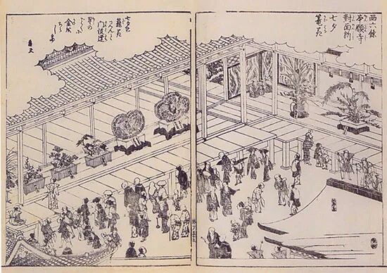 同时,义满将7月7日牛郎、织女相会的行事活动与「花御会」相联结,变为规模盛大、既娱人又敬神的七夕法乐。人们藉着供养神佛的名义,在活动中享受耳目的欢愉,让自己从中也感到欢乐,在《看闻日记》中详细记载七夕法乐的具体情形。