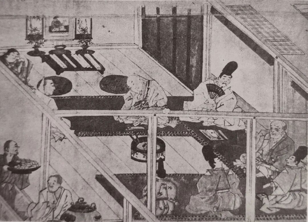 《慕归绘词》卷五有“西本愿寺觉如撰写闲窗集”的场面,正堂上悬有柿本人麻吕像,及墨竹的中国古制“三幅对”画轴;画轴前左右有瓶花一对,此插花形式与风格为我国宋元式样。日本插花受我国隋唐时代以后插花影响之深可以了然。