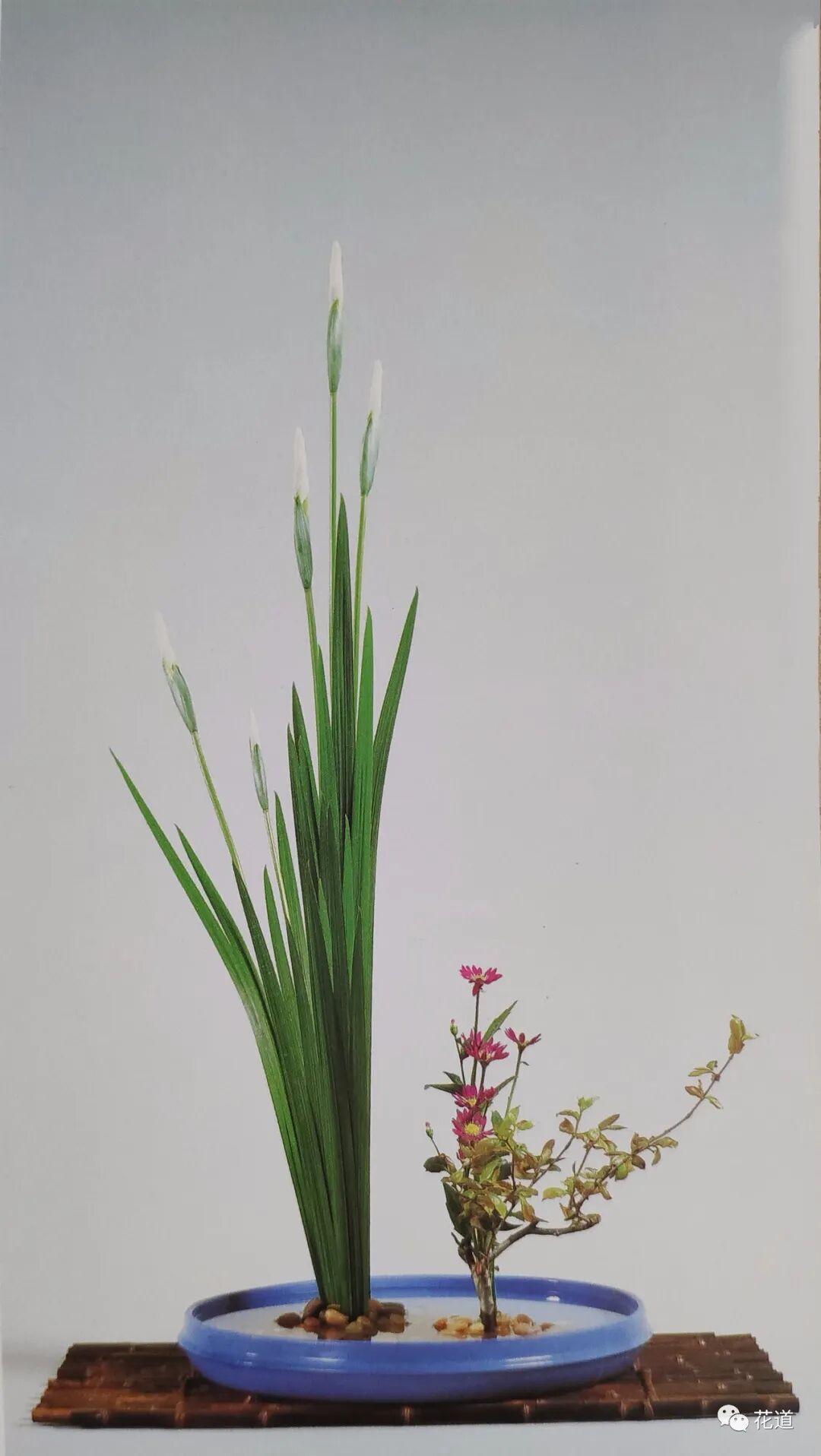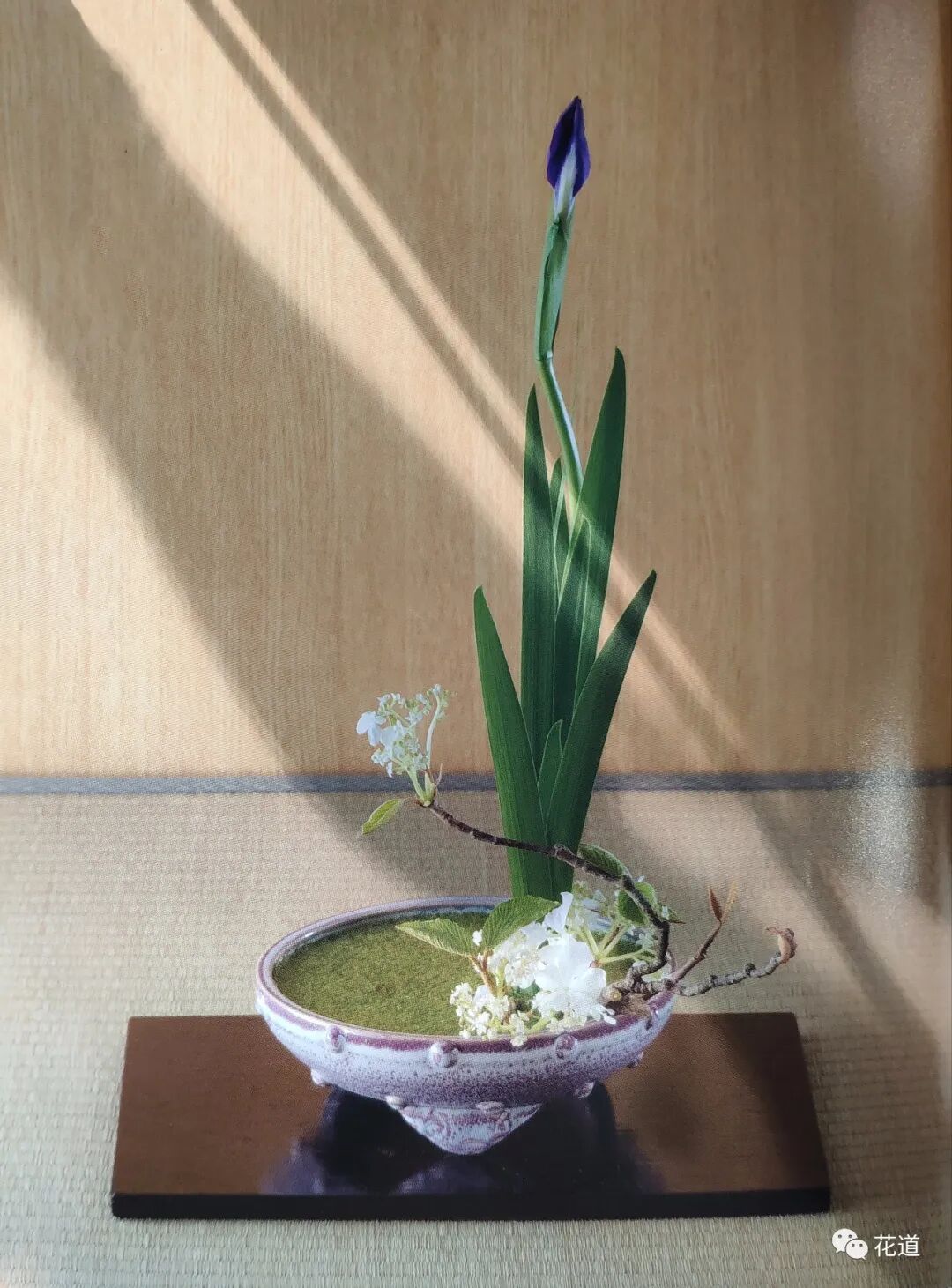 插燕子花,要将燕子花的四季变化之美,通过插花的方式表现出来,每个季节都要呈现出独特的美感。如春天有初露春芽的趣味,夏天有旺盛生长的繁盛之美,秋日有枯萎的侘寂风情等等……