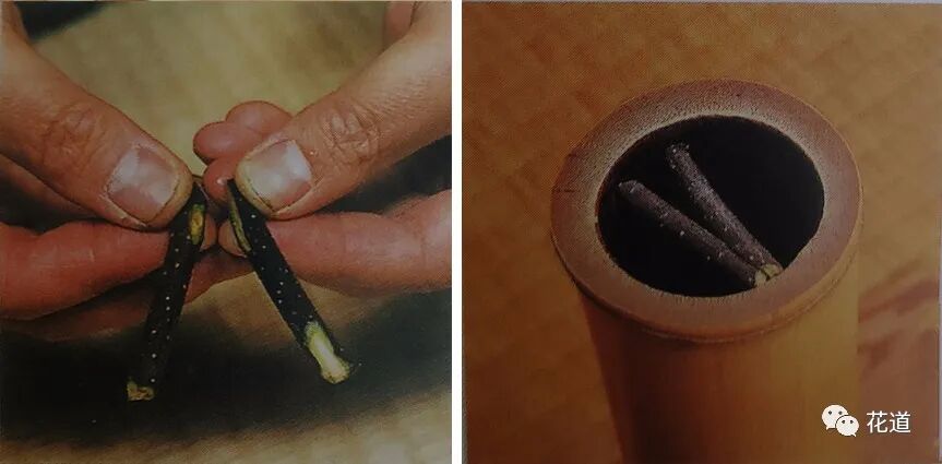 尺八因没有窗户的制约,可将花高耸地插入。插有高度的花,收紧底部的花姿会比较漂亮。可使用“V”字型固定法。即,先将两根小枝条的顶端削成斜面,然后将所削的面合起,组成V字形放入花筒。