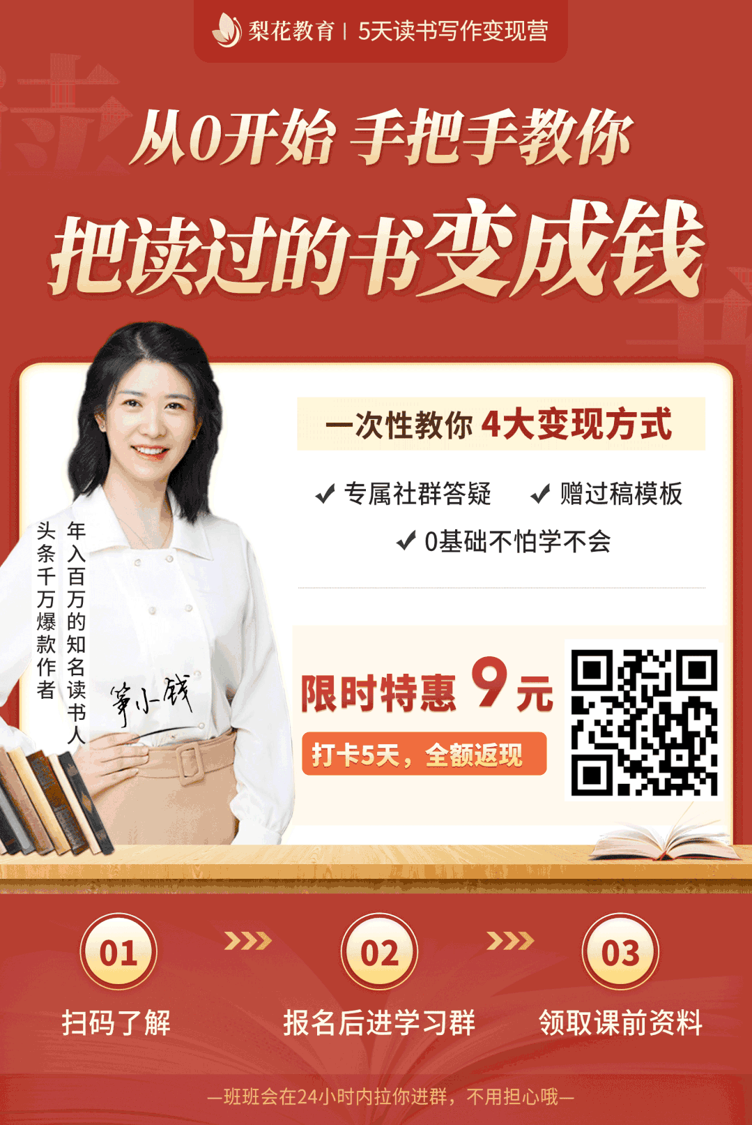 你知道嘛,会读书,不仅能挣钱,更能帮你顺利实现弯道超车!比如说,写短短300字的荐书稿,吸引别人来看书买书,相当于培养你1分钟快速表达的能力;试想,将来这项技能教给孩子,孩子能不聪明嘛?亲子关系能不和谐嘛?可以说,学会读书,就是让你在生活育儿各个方面都超人一等,既赚钱又增长了智慧~你是否也很想像我,还有无数普通人一样,通过读书轻松赚钱?现在,我把带我们赚到钱的 梨花教育【5天读书变现体验营】 推荐给你,手把手教你把读过的书变成钱!?限时特惠只需9元:坚持5天打卡后,还能全额申请退学费!相当于免费参与!押9块钱,抽5天时间,就能免费获得这个读书赚钱技能,简直不要太划算!但最重要的是,希望你能多学会一门技能,有底气有能力去抵御生活带给你的风雨坎坷!如果你想让自己赚更多的钱,想让自己的生活多一点退路,这一次,希望你别错过!靠谱的老师+靠谱的平台,这也是我推荐这门读书变现营给大家的主要原因:训练营的老师是读书界大咖、资深写作教练——筝小钱老师。曾经的她毕业3年月薪不到3000,天天忙到脚不沾地却扔被老板辞退,失业后的她干啥亏啥,内心自卑到极点,生活暗无天日。接触到读书稿后,筝小钱的整个人生都发生了翻天覆地的变化。不仅实现财富自由,一举拿下拿下一线城市500万的学区房。还因书稿写的实在太好,被不少出版社争相邀请授课,成为多家出版社特邀的座上宾!回想起以前的日子,她常常问自己,如果当初被生活打倒,没有选择读书赚钱,又会是什么模样呢?她知道,这个世上还有许多人和曾经的自己一样,生活又累又苦又穷,无力改变。于是,筝小钱怀着让更多人改变处境的初心,带来了这门能帮助普通人蜕变的课程。而且,老师还会在课程里面告诉大家4个一定赚钱、循环赚钱、不断赚钱的变现项目——书评变现、说书变现、课稿变现、社群领读。