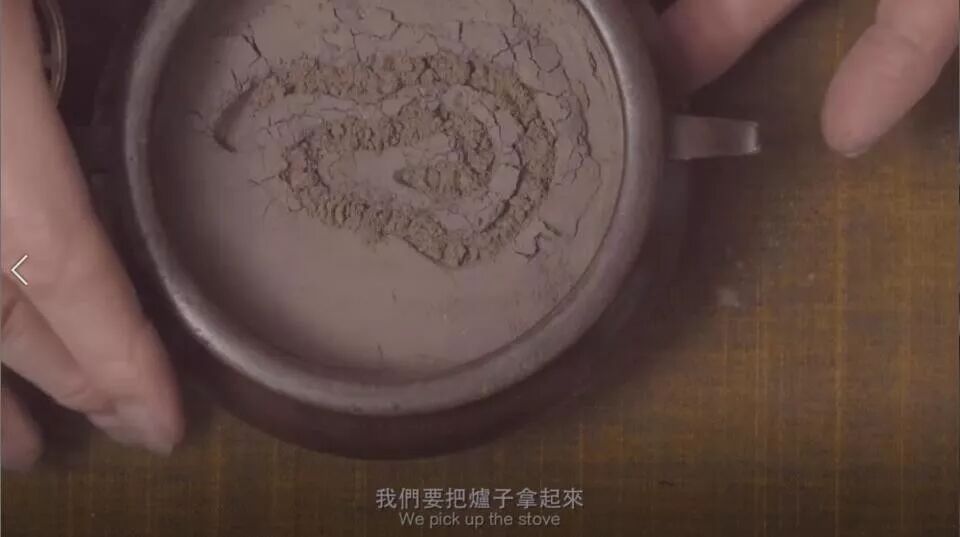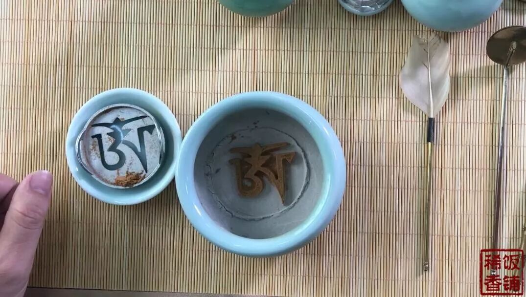 最后,我们一起看首先,是倒香灰,在香炉中放入香灰,约八九成满。然后,用灰押将香炉中的灰铺平,不需要压实,只稍微铺平整即可。打香篆的时候,是将香篆的模子压在香灰里,而且压在香灰里的深度要高于这个模子,打出来之后,会形成一个凹槽状。最后,将香粉填进这个凹槽,形成一个阴篆纹,稍作整理之后就可以开始燃香了。