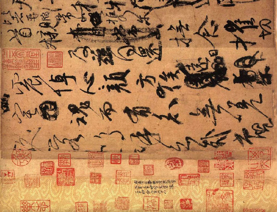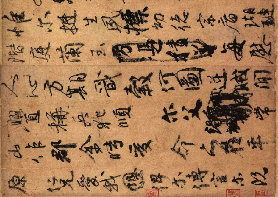 此稿渴笔较多,且墨色浓重而枯涩。这与颜真卿书写时所使用的工具(短而秃的硬毫或兼毫笔、浓墨、麻纸)有关。这一墨法的艺术效果与颜真卿当时撕心裂肺的悲恸情感恰好达到了高度的和谐一致。而此帖真迹中,所有的渴笔和牵带的地方都历历可见,能让人看出行笔的过程和笔锋变换之妙,对于学习行草书有很大的益处。