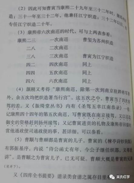 第五条,《红楼梦》第十六回,赵嬷嬷向王熙凤讲述江南甄家四次接驾之事,比对历史,康熙皇帝六次南巡,后四次都由江宁织造曹家接驾,这是无可争论的史实。这一条是曹学创始人胡适的“立学”之本,自胡适把江南甄家比附曹家开始至今将近百年了,曹学家们依然把这一条当做颠扑不破的铁证。其实这一条所谓的“铁证”已经成为曹学对《红楼梦》文本囫囵吞枣、断章取意的明证,也是曹学自诩考证,嘲笑索隐,以考证之名行索隐之实的明证。要说清楚这个问题必须完整了解这段情节。元妃要省亲,贾家准备建造省亲别墅。凤姐笑道:“若果如此,我可也见个大世面了。可恨我小几岁年纪,若早生二三十年,如今这些老人家也不薄我没见世面了。说起当年太祖皇帝访舜巡的故事,比一部书还热闹,我偏没造化赶上。”赵嬷嬷道:“嗳哟哟,那可是千载希逢的!那时候我才记事儿,咱们贾府正在姑苏、扬州一带监造海舫,修理海塘,只预备接驾一次,把银子都花的倘海水似的!说起来……”凤姐忙接道:“我们王府也预备过一次。那时候我爷爷单管各国进贡朝贺的事,凡有的外国人来,都是我们家养活。粤、闽、滇、浙所有的洋船货物,都是我们家的。”赵嬷嬷道:“那是谁不知道的?如今还有个口号儿呢,说‘东海少了白玉床,龙王来请江南王’,这说的就是奶奶府上了。还有如今现在江南的甄家,嗳哟哟,好势派!独他家接驾四次,若不是我们亲眼看见,告诉谁谁也不信的。别讲银子成了土泥,凭是世上所有的,没有不是堆山塞海的,‘罪过可惜’四个字竟顾不得了。”