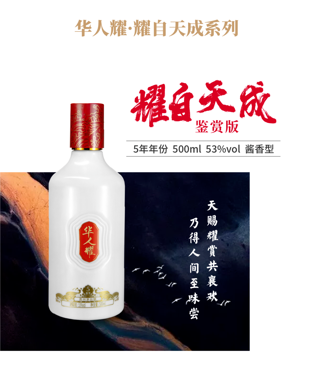 华人耀酱酒系列产自茅台镇7.5平方公里核心产区,优选有机天然的糯红高粱为料 ,秉承茅台镇繁复的12987古法工艺酿造,遵从道法自然,阴阳致和,顺天道得天赠,天窖地藏,方得口感醇厚、酒香绵长的华人耀酱香白酒。华人耀酱香酒,彰显文化内涵,传承品质酱香!