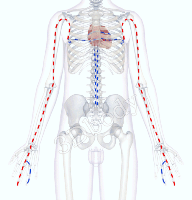 循行:心主手厥阴心包络之脉,起于胸中,出属心包络,下膈,历络三焦。其支者:循胸出胁,下腋三寸,上抵腋下,循臑内,行太阴、少阴之间,入肘中,下臂,行两筋之间,入掌中,循中指,出其端。其支者:别掌中,循小指次指出其端。