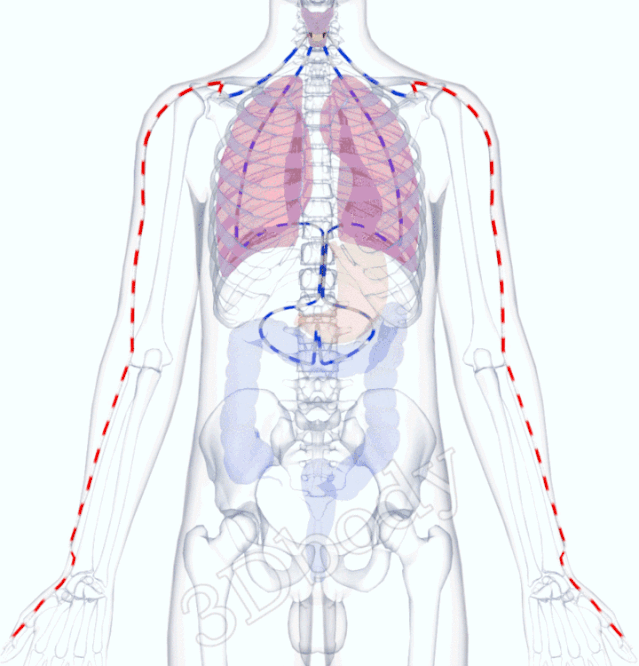 循行:肺手太阴之脉,起于中焦,下络大肠,还循胃口,上膈属肺。从肺系,横出腋下,下循臑内,行少阴、心主之前,下肘中,循臂内上骨下廉,入寸口,上鱼,循鱼际,出大指之端。其支者,从腕后,直出次指内廉,出其端。