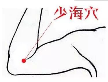 少海穴在肘横纹内侧端与肱骨内上髁连线的中点处,屈肘取穴。(此穴为双穴,左右各一)