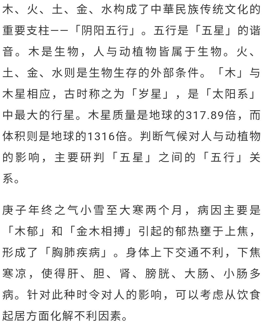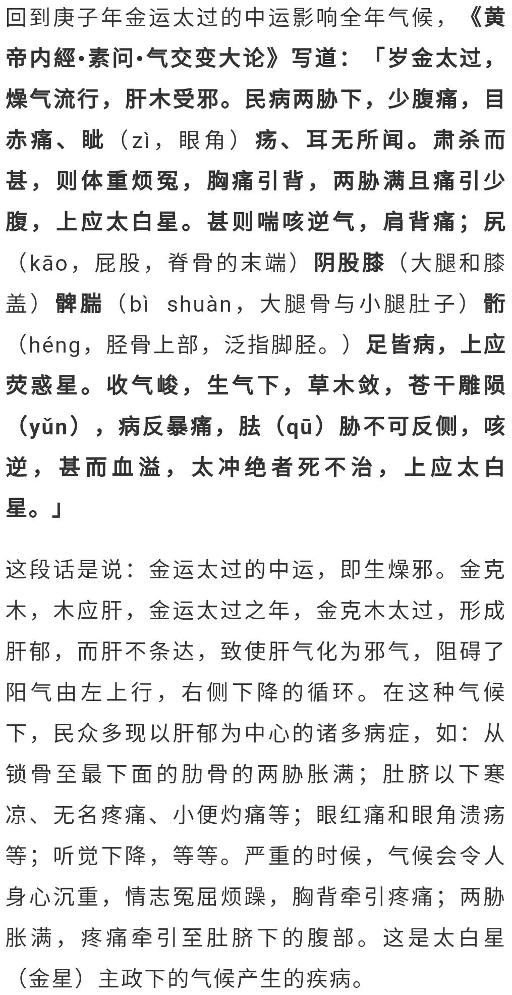 更严重的疾病是:剧烈的咳,因肾不纳肺气缺氧而逆喘;筋腱板结引起的肩背痛,尾骨下阴部及腿、膝盖与脚,出现各种病症。这是荧惑星(火星)影响地球的结果。包括庚子年在内的「少阴君火」司天,「阳明燥金」在泉的年份,金气收敛太过,终之气金星主政更甚,万物的生发之气受到抑制,导致草木的生发结果不得饱满(果实的香甜也不如往年);在金气太过的气候下,连古树都会受到伤害,甚则枯死;可能出现民病「暴痛」的情形;腋下腰上的部位和两胁不能反转(肝郁之症);咳逆严重者,会出现血液溢出脉管之外的情形;如果太冲脉绝(太冲脉被称为「十二经脉之海」「五脏六腑之海」「血海」。),人有可能死亡。这是太白星当政出现的气候病。《黄帝内經?素问?六元正纪大论》在写到包括庚子年在内的「子」、「午」年小雪至大寒两个月气候时说:「终之气,燥令行,余火内格,肿于上,咳喘,甚则血溢。寒气数举,则霿(méng)雾翳,病生皮腠,内舍于胁,下连少腹而作寒中,地将易也。」