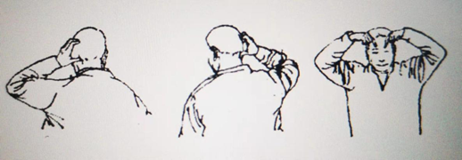 盘腿而坐,两手臂贴在侧胸部,两肘弯曲,两手由体侧上提至腋下,手心朝上。然后两手掌心向正前方推出,直到两臂伸直,与肩同宽同高,同时头向左侧转动。然后两手回收至腋下,掌心恢复向上,头转向正前方。再重复上述动作,两手推出时头转向右侧。如此左右各做42次。最后上下牙齿相叩36下,深呼吸、咽口水9次。可预防和治疗胸部、肩背经络的虚劳和邪毒、牙齿疼痛、颈部肿痛、身体寒战、红肿热痛耳聋耳呜、耳后肩臂疼痛、皮肤肿胀、瘙痒等。