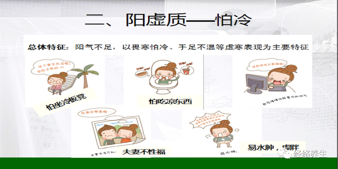 一、阴虚体质:这种人的体质特点为形体消瘦,手足心热,心中时烦,少眠,便干,尿黄,不耐春夏,多喜冷饮。