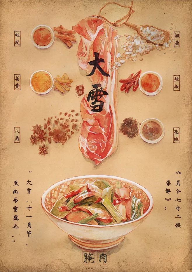 “大雪”,顾名思义,雪量大。古人云:“大者,盛也,至此而雪盛也。”到了这个时段,雪往往下得很大,范围也广,故名大雪。大雪是相对小雪节气而言,降雪的可能性比小雪更大,而不是指降雪量一定很大,和小雪、雨水、谷雨等节气一样,都是直接反映降水的节气。“大雪不冻倒春寒,大雪不寒明年旱”,形容大雪不冷的后果;“今年麦盖三层被,来年枕着馒头睡”,说的是如果大雪覆盖大地,融雪会给土壤增加水分含量,有一定肥田的作用。大雪是寒季,要做好内在阳气的保养和封藏工作,尽量减少消耗。不熬夜,不做剧烈运动,不大喜大悲,使精神内守,这样才能安稳。