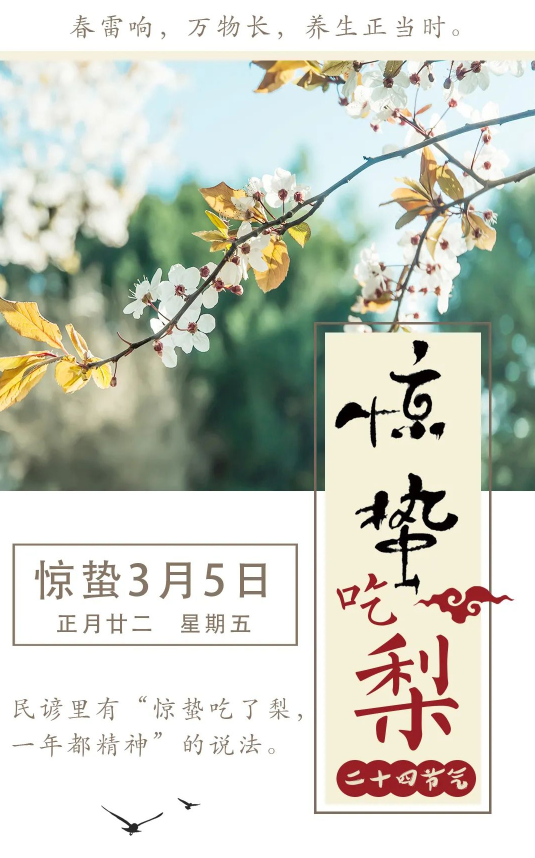 4、苏北及山西一带有惊蛰全家吃梨的习俗,并流传有“惊蛰吃了梨,一年都精神!”的民谚。也有人说“梨”谐音“离”,据说,惊蛰吃梨可让虫害远离庄稼,可保全年好收成。