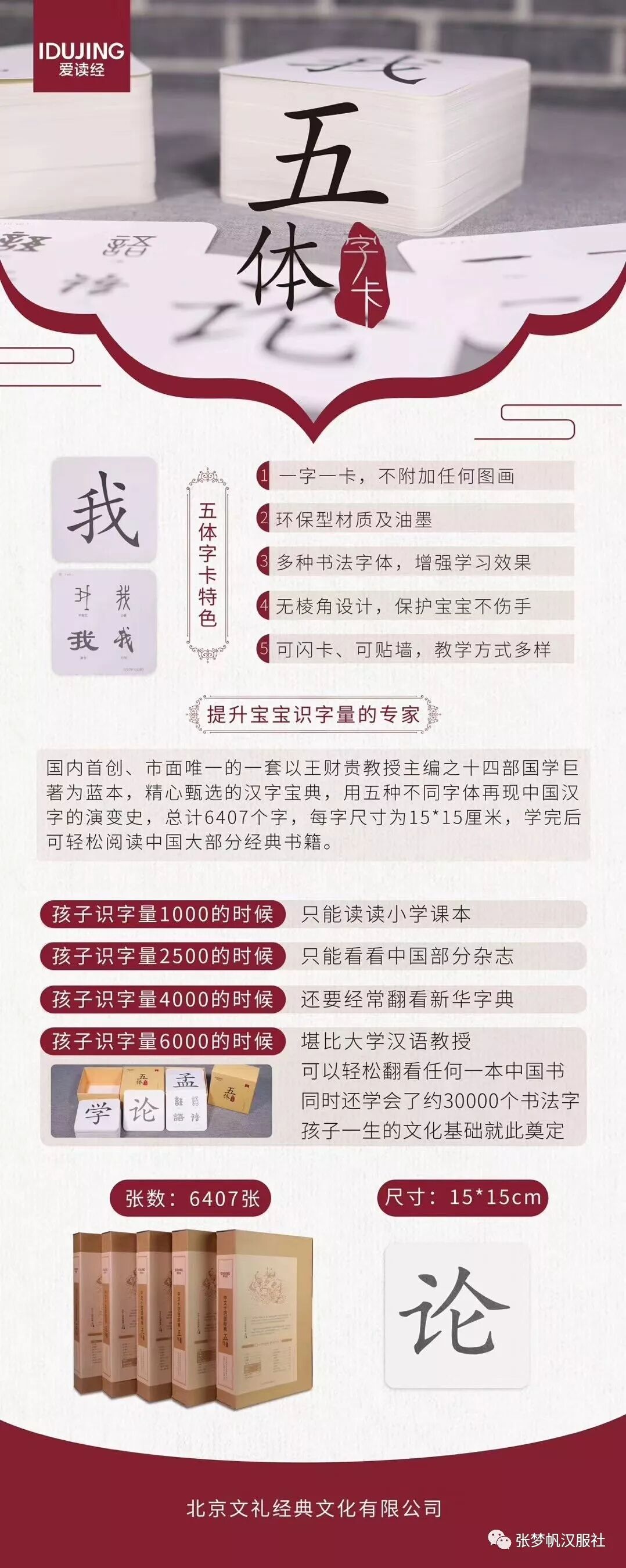 读经经典五体字卡为业内首创,选用王财贵教授编订14部中文经典所有字,学完6407 张字,可无障碍阅读任何一本书。孩子识字量1000的时候只能读读小学课本,孩子识字量2500的时候只能看看中国部分杂志,孩子识字量4000的时候还要经常翻看新华字典。孩子识字量6000的时候,堪比大学汉语教授,可以轻松翻看任何一本中国书,同时还学会了24000种书法字体。字卡尺寸:15cm*15cm。