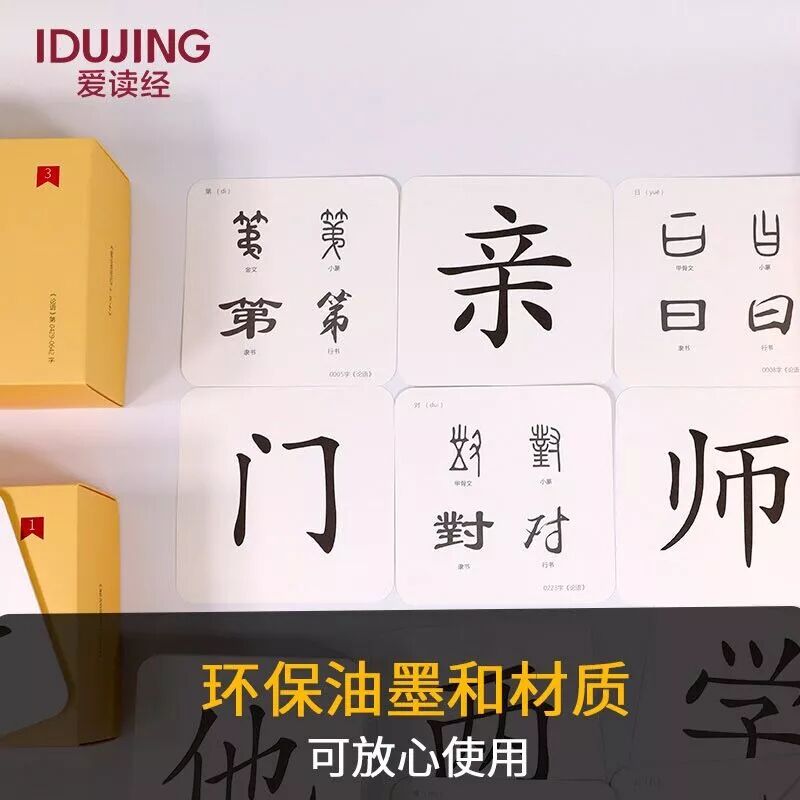 选取经典书籍《论语》中不重复的1338个字,制作1338张字卡,字卡尺寸为10*10cm,正面为印刷体楷书,背面有拼音及同一个字的书法体小篆、隶书、行书、草书,多数字还附有甲骨文、金文等,都选用 名家书法。是孩子认字,右脑开发的好帮手。