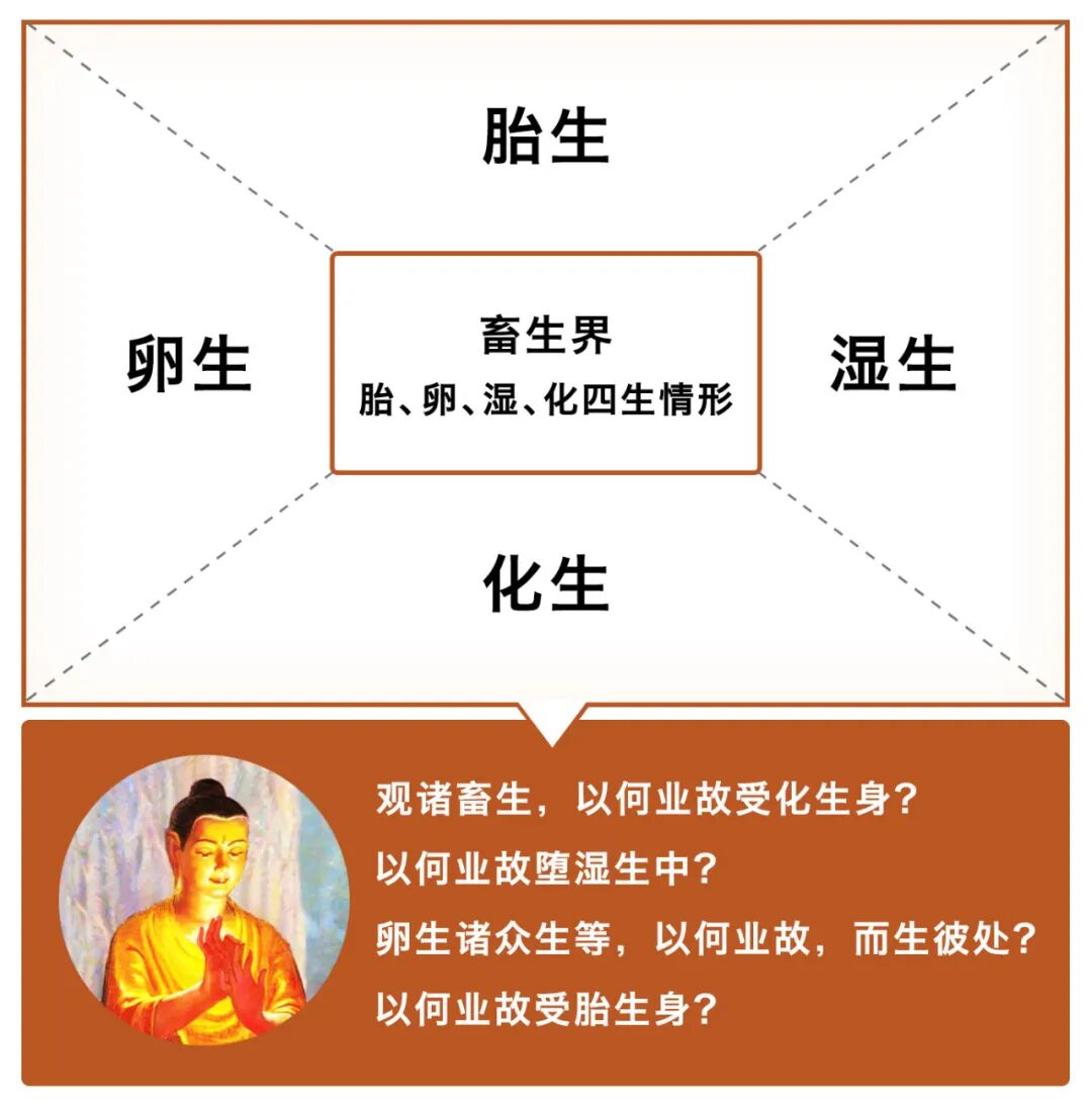 再者,比丘为了认识业果,又来观察畜生胎、卵、湿、化四种生态的情形,首先观察化生的由来。他去认识,以什么业而导致受了化生的身即以闻慧,知此众生,于前世时,为求丝绢,养蚕杀茧。或蒸或煮,以水渍之,生无量虫,名火髻虫。有诸外道,受邪斋法,取此细虫,置于火中,供养诸天,以求福德。身坏命终堕于地狱,具受众苦。从地狱出,生于俱舍诸化生中,种种异类。他以闻慧知道这类众生,前世的时候,为了求得丝绢就养蚕杀茧,或者蒸或者煮,以水来浸,结果里面生了无数的叫做“火髻虫”的小虫。那些外道受邪斋法,取这些小虫放在火当中祭祀,供养诸天来求福德。结果他由于这样杀生无数的缘故,死了以后就堕在地狱里,各种各样的苦无不俱受。从地狱出来,还要生在俱舍诸化生种类里,做各种不同种类的旁生。复次比丘,知业果报,观诸畜生,以何业故堕湿生中彼以闻慧,知此众生,起恶邪见,杀害龟、鳖、鱼、蟹、蚌、蛤。及小池中,多有细虫,或酢中细虫,或有恶人为贪财故,杀诸细虫,或邪见事天,杀虫祭祀。身坏命终堕于地狱,具受众苦,不可称计。从地狱出受湿生身,或作蚊子,或为蚤虱。再者,比丘为了认识业果,又观察诸畜生,以什么业行堕在湿生类的旁生当中他以闻慧知道,这个众生过去起了很坏的邪见,杀害龟、鳖、鱼、蟹、蚌、蛤。以及小池里有很多小虫,或者在做一种调味用的酸味液体(即醋)当中有很多小虫,或者有些恶人为了贪财的缘故,杀掉这些小虫,或者以邪见事奉天神的缘故,杀虫祭祀。结果以这种杀生业,他们死了就堕进地狱,受了各种各样的苦,无法计算。从地狱出来,还要受湿生旁生的果报,有些做虫、蚊子,有些做跳蚤、虱子。就像这样,都是地狱众生出来,就做这种很低级的旁生。观二种生已,如是次第,以微细心,观业果报。观于卵生诸众生等,以何业故,而生彼处若人未断贪欲、恚、痴,修学禅定,得世俗通。有因缘故,起嗔恚心,破坏国土。是人身坏命终堕于地狱,受无量苦。从地狱出,受于卵生飞鸟、雕鹫之形。从此命终若生人中,常多嗔恚,以余业故。比丘这样观察了化生、湿生之后,又依次第以微细心观察业果。所谓“微细心”,就是一分一分很细地了认的心,而不是粗略过去。他接着观察四生中的第三种生——卵生,到底是以什么样的业行而生在那里呢他发现有一类人,没有断除贪欲、嗔恚和愚痴,修学禅定得了世俗神通。有因缘的缘故,起了嗔恚之心,破坏他者的国土。以这些世间神通会做一些破坏,比如降恶雨,或者摧毁山林等。这个人身坏命终就堕在地狱里,受无量的苦。从地狱出来,会受蛋生的飞鸟、雕鹫的形体。好多好多的旁生,都是地狱众生出来以后要受这样的报,它们好像从最重的劳改刑场出来以后,又到轻度的劳改刑场里受报那样,所以,这些生命体看起来总是没有丝毫的笑容等等,还是受着很大的业报的逼迫。从那个旁生里命终以后,如果生在人中,他的性情还是多发嗔恚,常常起嗔心,这是以余业残余势力的缘故。也就是,过去他的嗔恚心很强,一见什么就起很大的嗔恚,结果以神通破坏国土。这种造作的习性,经过无数年以后生到人里,还是一见什么就发脾气、动怒,这是由过去的串习力而来。复次比丘,知业果报,彼以闻慧,观诸畜生,以何业故受胎生身若有众生,以欲爱心,和合牛马,令其交会以自悦意,或令他人邪行非礼。是人身坏命终之后堕于地狱,具受众苦。从地狱出,受于胎生畜生之身。若生人中,受黄门身,以余业故。再次,比丘为认识业果,他又以微细心,再来抉择畜生界业果的情形。他以闻慧观察,畜生是以什么业行而受胎生之身结果就看到一类众生,以欲爱之心让牛马和合,让它们交会来自己悦意,或者让他人邪行非礼。这个人身坏命终以后堕进了地狱,各种各样的苦无不具受。漫长地受苦之后,地狱的报消了,还要受余残的果报,也就是会受胎生畜生的身体。假使生在人中,还要受黄门之身,这也是余业势力的缘故。也就是从前行邪淫之类的业,结果会堕畜生的胎生,诸如此类,这是其中的一小分状况。业有无数的种类,但是透过这样一分状况,心里会确定,什么样的受生的情形,都是由业所决定的。