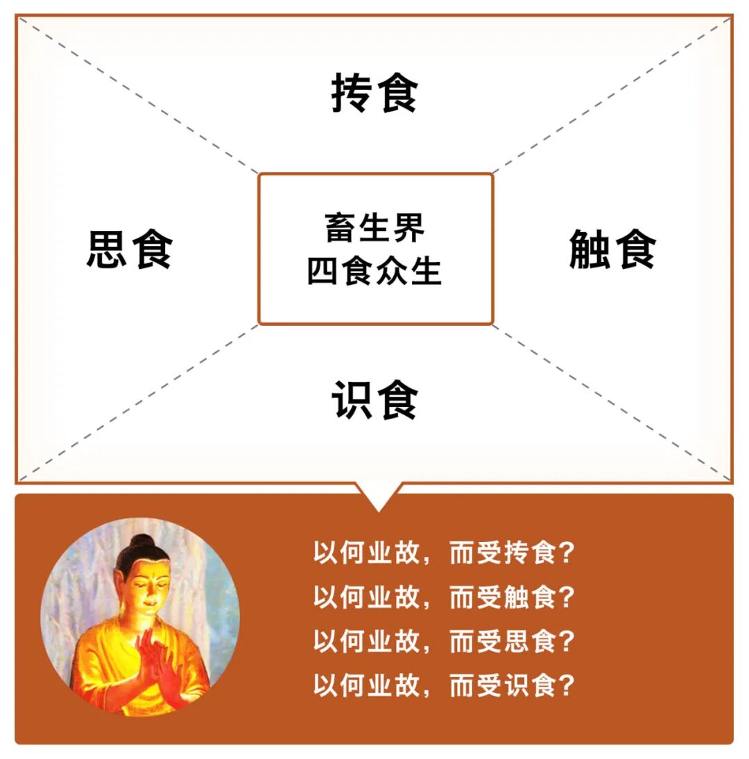 复次比丘,观十一种畜生已,次观四种众生,从地狱出,受四种食。何等为四一者抟食,二者意思食,三者触食,四者识爱食。再者,比丘观察了十一种畜生的生态现象后,他再观察四种众生,从地狱出来,受四种食。哪四种食呢抟食、意思食、触食和识爱食。欲界众生以饮食、男女为最大的增上缘,畜生界自不例外,这个饮食是最大的现相。那么,畜生界里有这四类的食的方式,实际都是由业所决定的。比丘思惟观察四食果报,以闻慧观,见有众生,以诸抟食,与恶戒者及诸贼人。既食之后,令此贼人杀害除怨,是贼受语即杀彼怨。如是恶人,身坏命终堕于地狱,具受众苦。从地狱出,堕于段食畜生之中,受水牛、牛、羊、驼、驴、象、马、猪、狗、野干、獐鹿、??牛,乌、鸱、雕鹫、鹅、鸭、孔雀、命命、鸿鸟、杂类众鸟,多处旷野险岸中生,是名少分抟食众生。比丘思惟观察四食果报,以及四种食以什么业感召此种果报。饮食方式是果报的现相,也就是由那种业,自然出现这种受用来滋养色身的方式。没有那种业,就不会产生那样的食的方式。他看到有一类众生,从前以诸抟食给那些恶戒者和那些盗贼。比如款待了一餐盛宴,他们都吃得很好,然后他就说:“你们帮我杀掉那个怨敌。”那些贼吃得很好以后,就接受了他的吩咐,杀掉了怨家。这个恶人身坏命终堕在地狱里,受尽了各种的苦。从地狱出来,由于他过去有这种业,也就那么恰如其分地堕在了段食(也叫抟食)畜生当中。受生为水牛、牛、羊、骆驼、驴、象、马、猪、狗、野干、獐鹿、牦牛,乌鸦、鹞鹰、雕鹫、鹅、鸭、孔雀、命命鸟、鸿鸟,各式各样的杂类众鸟,多数处在旷野险岸当中受生,这叫“少分抟食众生”。这是其中的一类业感现相,不是说全部都这样。复次比丘,观于触食众生之类。住在?中,或初出?,以触为食。复有众鸟,乐住水中,依岸为巢,或穿河岸以为巢窟,敷产卵?,龙蛇等类。再者,比丘很有兴趣,再观察触食众生类。它们住在蛋壳当中,或者最初出壳的时候,就是以触为食的;又有很多鸟,欢喜住在水当中,依着河岸为巢,或者就在河岸那里穿一个巢窟,就在那里面产卵,出现龙蛇等类。以何业故,而受触食比丘观察,即以闻慧,知此众生,于前世时,心许行施,思惟筹量,后心还悔而不施与。以不善业堕畜生中,以本思心受触食报。比丘观察,以闻慧认识到,这类众生前世有这样的业行。也就是心里先答应了要作布施,然后又在心里思惟筹量,有好多的计较,又认为吃亏了,不愿意给,而生了退悔,竟然没有施与。以这个不善业堕在畜生里面。由于他原本即宿世那时候的思心的业,在后来受畜生报的时候,就成了触食的类型,它是以触为食的。因此,这一切果上的现象,实际都是由业来决定的。就连一个生活的习性,也是过去熏建了相应的业习气,出现了那一种思心等,而出现了当前这种触食的报,可见这一切都是等流而来。复次比丘,观于思食诸众生等,以何业故,而受思食即以闻慧,知众生类,谓赤鱼子、堤弥鱼子、错鱼等子、螺蚌蛤卵,思心为食。若母忆念,则不饥渴,身命增长。以何业故,而生此处再者,比丘再来观察思食的众生类,是以什么业导致它是领受思食的这一切实际都是阿赖耶识中熏建了相应的业习气,到了一定的时候,就变出了这一世的果报,其中的一种果报现相就是饮食。那如何来食呢就是由过去的业来决定的。他以闻慧就知道,一类众生,叫做红鱼子、堤弥鱼子、错鱼等子,以及螺蛳、蚌蛤的卵,这一类小生命是要以思心为食。怎样的情形呢如果它们的母亲——鱼母等忆念它们的时候,它们就不饥渴,而且它们的生命能得以增长,这是不可思议的。即以闻慧,知此众生,愚痴少智,不识业果。许施人物而语之言,却后半月,或至一月,我当施汝财物饮食,金银珍宝。时彼贫人,闻其许施,心生欢喜,美言赞叹,一月半月望有所得。时贫穷人往至其家,是时其人更作异语,不复本信。如是恶人,命终之后,堕于忧喜地狱之中,具受众苦。他以闻慧认识,这类众生前世积集了这样的业。他们愚痴,很浅的智慧知道得不多,根本就不认识这个业果极重大的天律。答应了布施别人东西,对他说:“再过半个月,或者到一个月,我会布施给你财物、饮食、金银珍宝。”当时那个穷人,听到他应许了布施,心里很欢喜,然后美言赞叹:“您真是有德之人,您真是富贵大人!”诸如此类作了赞叹。一月半月,他眼巴巴地盼望能得到那份好的财富。那时,那个贫穷人就到那富人家里,然而那个富人又转变话语说:“哦什么时候答应过你啊”诸如此类,不再守过去的承诺。这样的恶人命终之后,就堕在忧喜地狱当中,受各种的苦。顾名思义,叫做“忧喜”,就是由于过去前头让人喜,后头让人忧,这回因果律的反应,自身就堕在那种先喜后忧的状况里,受各种的苦(或许是这样吧,因为定义了叫“忧喜地狱”)。从彼命终,堕畜生中,意思为食。以其前世,许他贫人令生欢喜,后竟无实,以是因缘。若生人中,为人奴婢,以余业故。那么,从地狱命终以后还堕在畜生里,这一类旁生以意的思作为食物。由于前世答应穷人,让他生了欢喜,后来就一无所得,也就是让人想啊想啊,总是想要得到那东西,后来又得不到,因此,他所感召的果报,老是用思来作为食物,其他是吃不到的,可见因果律丝毫不乱。如果生在人中,会很下贱,做人家的奴仆,这是由余残业所变现的。复次比丘,知业果报,观诸畜生第四识食。即以闻