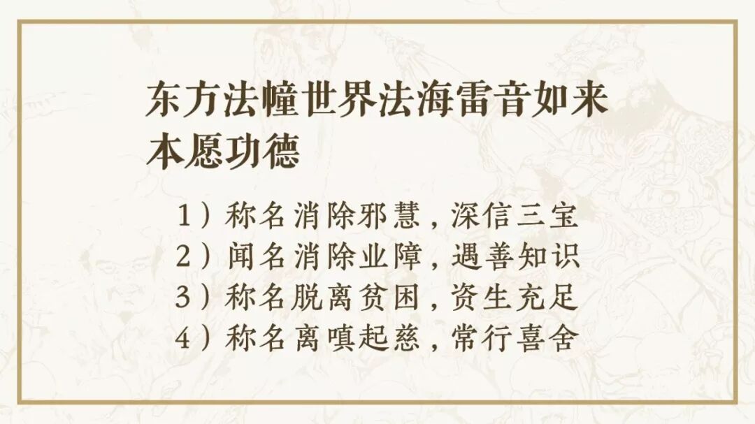 若有净信男子、女人,闻彼佛名,至心礼敬,殷勤供养,受持念诵,业障消灭,得不退转菩提之心,具宿命智。所生之处常得见佛,无病长寿。命终之后生彼国中,衣服饮食资生之具,随念皆至,无所乏少。曼殊室利,彼佛世尊具足如是无量功德,是故众生常当忆念,勿令忘失。如果有净信男子、女人,闻信彼佛名号,至心礼敬法海雷音如来,殷勤供养如来,受持念诵,由此会消灭业障,得不退转菩提之心,具宿命智,能够知道宿世的情形。所生之处常常见佛,无病长寿。再者,命终之后能生到彼佛国土,衣服、饮食、资生之具随忆念就能现前,无所缺乏。曼殊室利,彼佛世尊具足如是无量功德,所以,众生要常常忆念法海雷音如来,不要忘记。