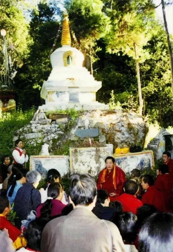 在青普神山,护法以不可以思议的形式交付法王一个吉祥海螺状的伏藏品宝箧法王如意宝从尼泊尔出发到印度,途中在转绕夏绒卡秀塔时留影