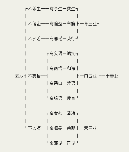 所谓十善,乃是五戒的扩大与加深,并且要戒作恶,也戒不去行善,现在列表如下: