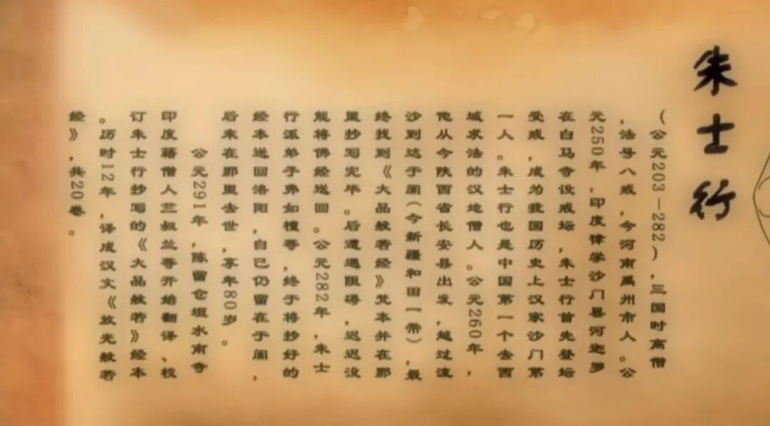这是丝绸之路上最艰难的一段旅程,在葱岭以东的沙漠深处,一行人正在艰难前行,他们不是商人,也不是使团,他们是僧人,为首的长者是已经五十八岁的朱士行,中国第一个受戒出家的僧人。公元260年,朱士行一行从长安出发,穿过河西走廊,西出玉门关,进入戈壁,他们已经行走数月,身体极度虚弱,但他们还需要在沙漠中度过50多天才能到达日夜向往的地方—西域于阗。作为丝绸之路的中枢,西域不仅是东西方商贸往来的盛地,中西文化也在此交流汇聚,魏晋时期,佛教在西域兴盛,成为西域各国最富生机的社会信仰,在于阗国的国都,每一年都会举行一场盛大的法会,来参加法会的,除了僧尼徒众,于阗的王公贵族、市井百姓,还有来自中原和周边各国的商人。于阗国的都城正是朱士行的目的地,除了能够参加法会,感受浓郁的佛教气氛,他还有更为重要的使命,他必须在这里找到真正的梵本佛经,并且带回中原,只有西域,才有代表佛法真谛的经书可寻。中国佛教的发展,也就是不断翻译,不断理解,不断发展西来佛教的经典教义的结果,这三者缺一不可,这三者的基础是什么,基础就是我们从西方求来更多的经典。佛教,起源于公元前六至五世纪,佛教创始人释迦牟尼生于古印度迦毗罗卫国,佛陀涅盘之后,他的弟子根据他在世时的言教,结集成佛教典籍、佛经。从公元前260年开始,佛经有天竺僧人带入西域,在这里绚丽绽放,西域成为佛教的第二故乡,是当时佛法最兴盛的地区,随着西汉丝绸之路的繁荣,佛教也一路东行,渐渐延伸到中原地区。到了东汉初年,汉明帝派遣使节从西域请来了两位天竺高僧,他们的白马千里迢迢驼来了佛像佛经,虔诚的明帝下令仿造印度样式在洛阳城建寺,迎请天竺高僧入住,为纪念白马驮经之功劳,寺院命名为白马寺。河洛之滨的天子脚下诞生的中国最早的佛寺,朱士行正是在白马寺登台受戒,成为汉家第一个受戒僧人,他在白马寺度过了十年的时光,自从西域求法后,再也没有回到过这里,13年之后,白马寺迎回了中原僧人们梦寐以求的大品般若经,这部60万字的佛经,是朱士行在于阗国一丝不苟、亲手抄写完成的,他的弟子遵循他的嘱托,将经书送回中原,而他自己因为年迈,没能踏上归程。
