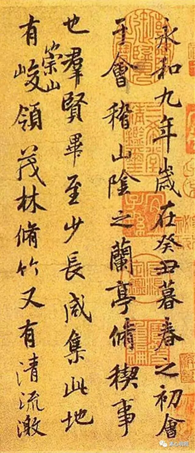 乾隆皇帝手上,一看,好嘛,你这个项元汴,空白处都被你盖满了,你让朕盖在哪里呢天子就是任性,于是把印章盖在字上,也无所谓了。无论印章盖了多少印,盖的地方是否合适,都代表了对兰亭序的喜爱迷恋。兰亭不仅是一个地名,一件作品,更是中国文化的一个灿烂的符号。永和九年以来,每个文人心里都有一个兰亭,从那么多的版本,印章,关于兰亭数不胜数的文章诗词,书画作品,包括故宫乾隆花园里的契赏亭,乃至建国后那场兰亭论辩,都是兰亭文脉的延续。