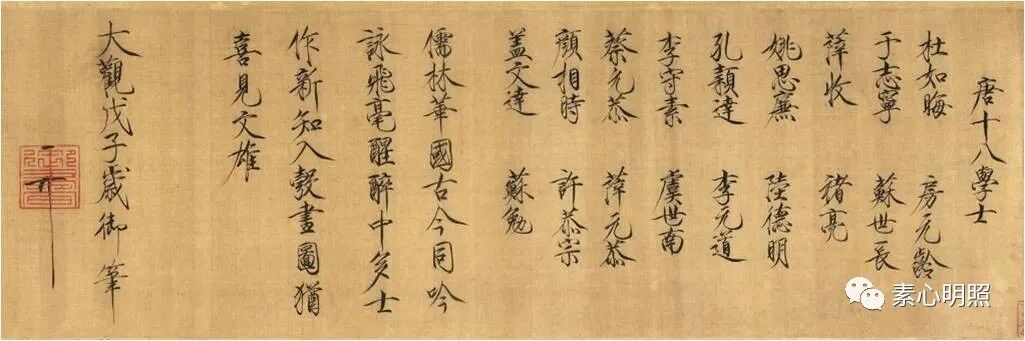 唐代崇贤馆的执行馆主是虞世南这样德艺双馨的人。唐太宗称他德行、忠直、博学、文词、书翰为五绝:“世南一人,有出世之才,遂兼五绝。一曰忠谠[dǎng] ,二曰友悌,三曰博文,四曰词藻,五曰书翰。”世南之德,从唐史去看,就知道他曾经想替哥哥世基代死,其孝悌如此。宋徽宗赵佶曾经亲自画过《十八学士图》,并为他们题名: