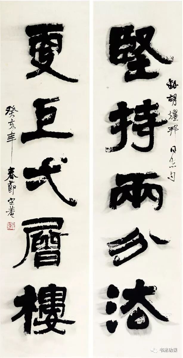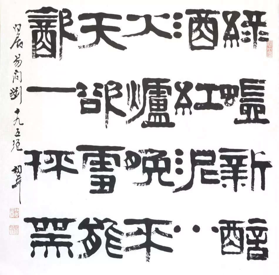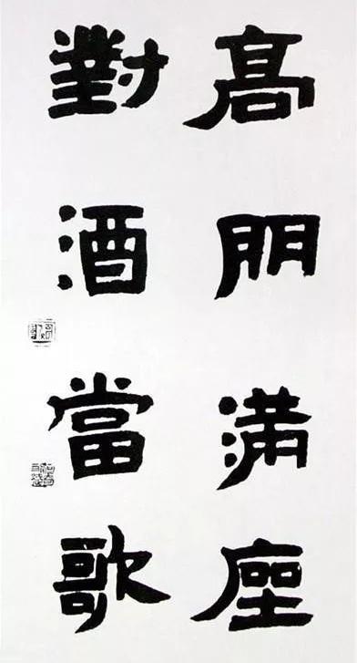 何来胜的出发点仍是伊秉绶,藏巧于拙,奇正相生,雄浑高古是其主基调,但他有意将魏碑方折之笔,融入隶书中,故其隶书更显方整刚毅,何来胜特别注重笔划两端的细节变化和中段的厚实处理,强化点笔的起止向背,作品更具装饰性和现代感。